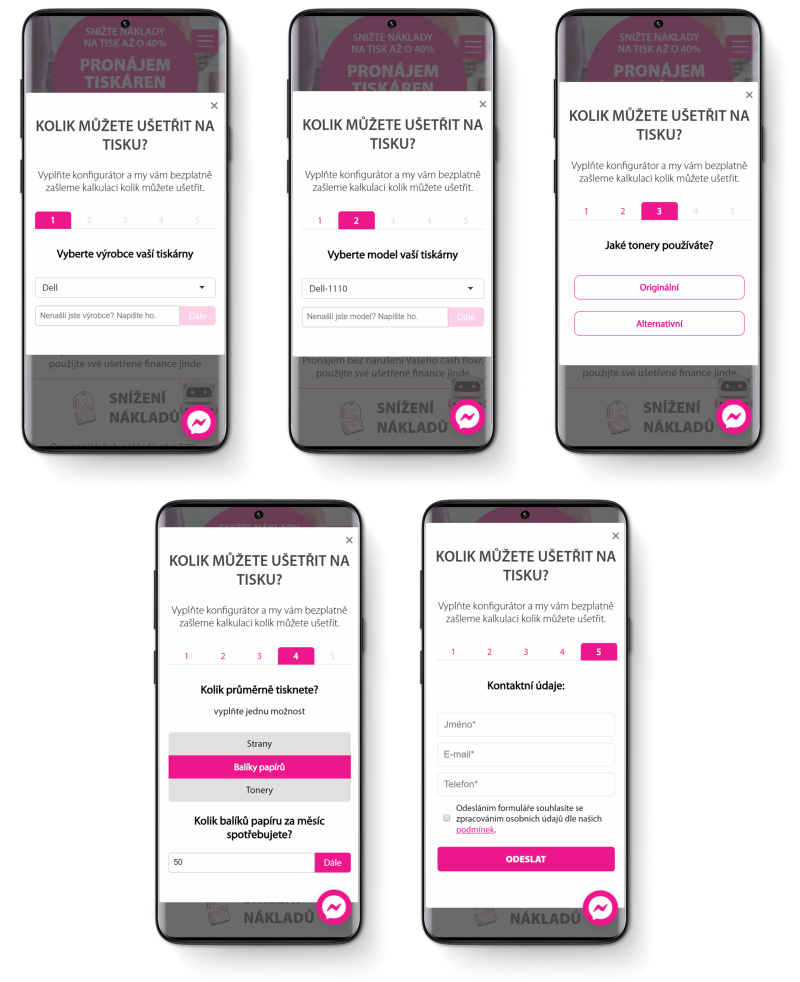 V tomto kroku jsme využili konfigurátor, což je jakýsi návodný dotazník k tomu, jakou tiskárnu by si zákazník měl od nás půjčit, aby co nejvíce ušetřil na tisku. Konfigurátor je tedy nejrychlejší a nejjednodušší cesta, jak se zeptat zákazníka na to, co potřebuje vědět. Po vyplnění uživatel zjistí, jaká bude jeho finanční úspora na tisk oproti jeho momentálním možnostem, v případě pronájmu naší tiskárny.
